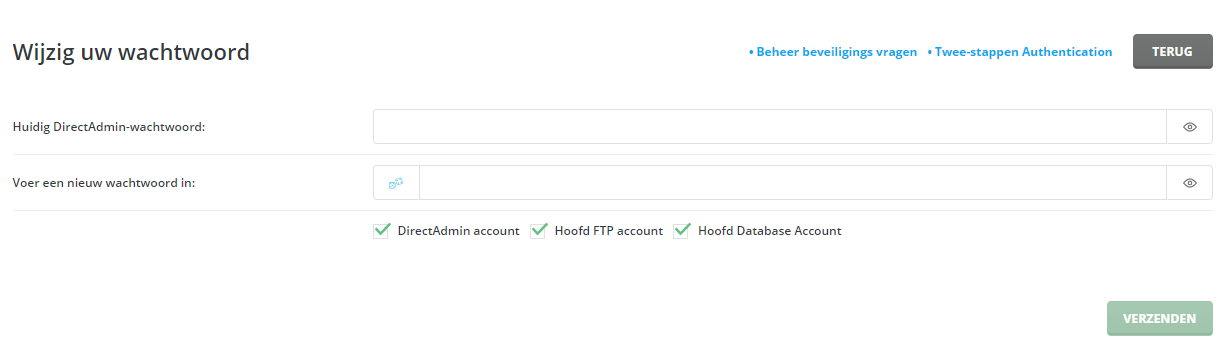 Vervolgens kun je het wachtwoord voor DirectAdmin aanpassen, desgewenst kun je ook de wachtwoorden van je hoofd FTP account en je hoofd Database account aanpassen.